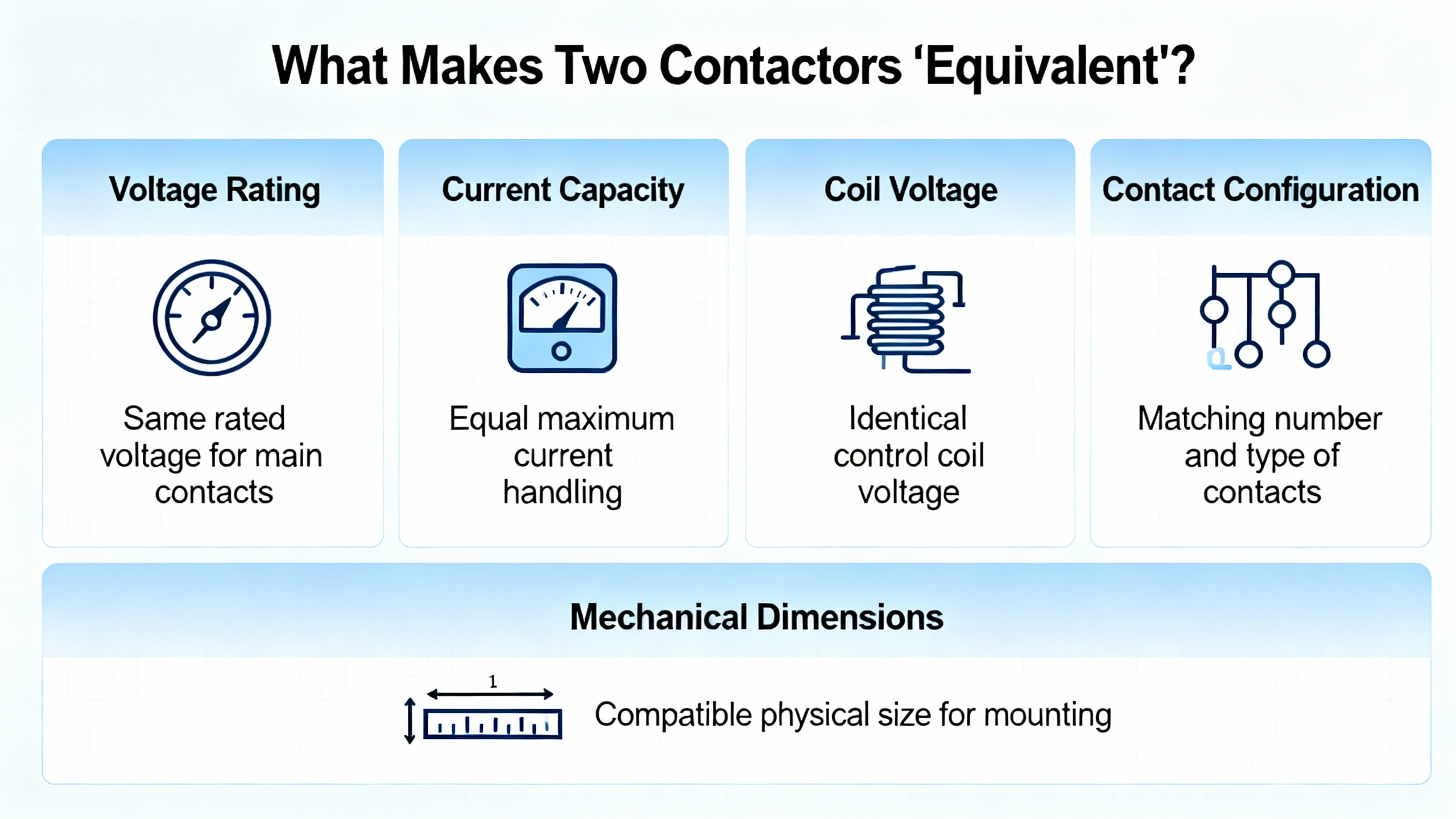 Two contactors are genuinely equivalent in a critical power application only if they meet or exceed the original device on both of these axes, plus a small set of mechanical, environmental, and safety criteria. Anything less is a compromise, even if the terminal layout looks nearly identical.