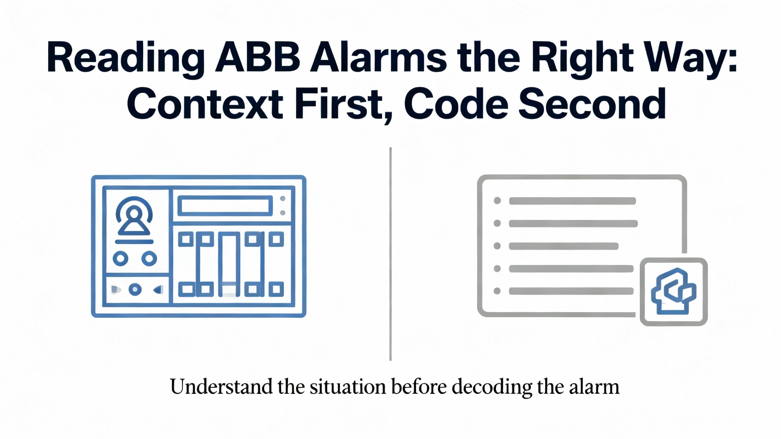 On ABB platforms, alarms are generated at multiple layers. The DCS raises system alarms such as a controller communication failure, a function block invalid state, or a channel out-of-range. Connected devices raise their own faults like overcurrent, DC bus high or low, motor overload or stall, phase loss, or memory-card errors. The DCS may pass through the device code, translate it into a tag-specific message, or compress it into a more general condition. Two devices can share a code label and mean different things, and two models from the same family can assign different meanings to the same numeric value. This is why model-specific references and the asset鈥檚 parameter backup are essential companions to any DCS alarm list.