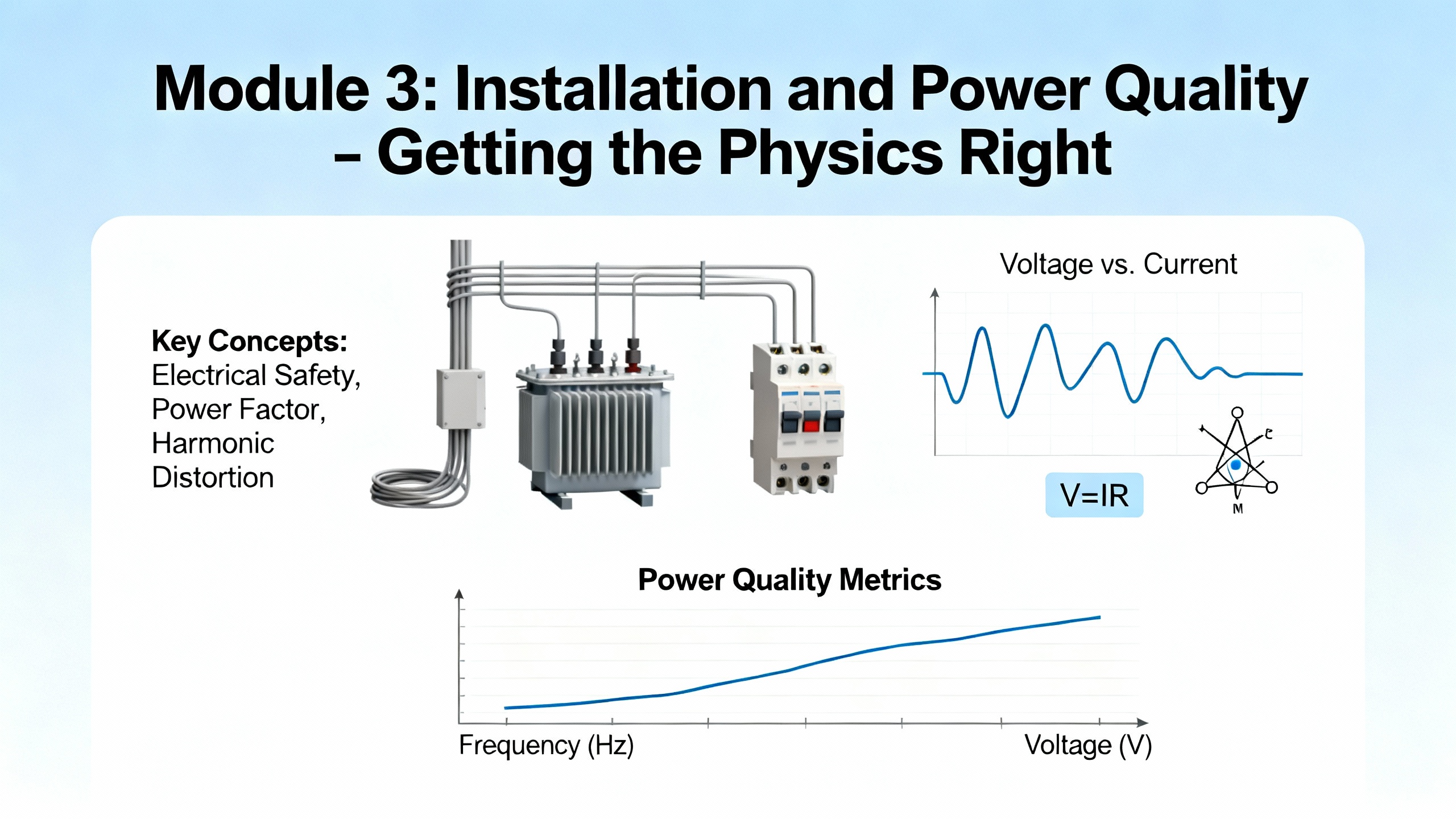 Throughout this module, safety is non-negotiable. Industry guidance consistently warns that DC bus capacitors can remain charged several minutes after isolation. Any course should drill lockout/tagout procedures, verification of absence of voltage, and respect for manufacturer-specified discharge times before accessing internal terminals.