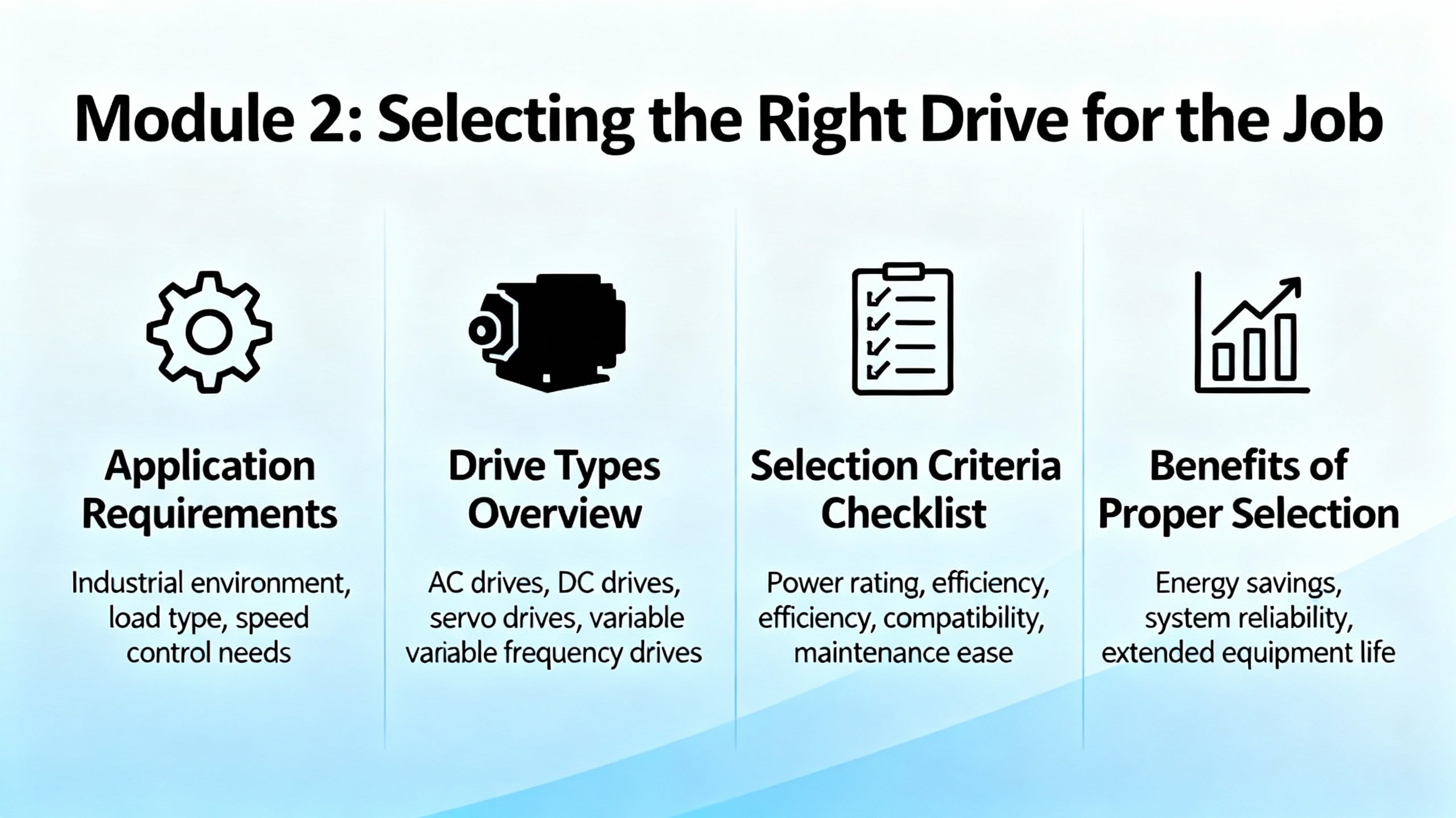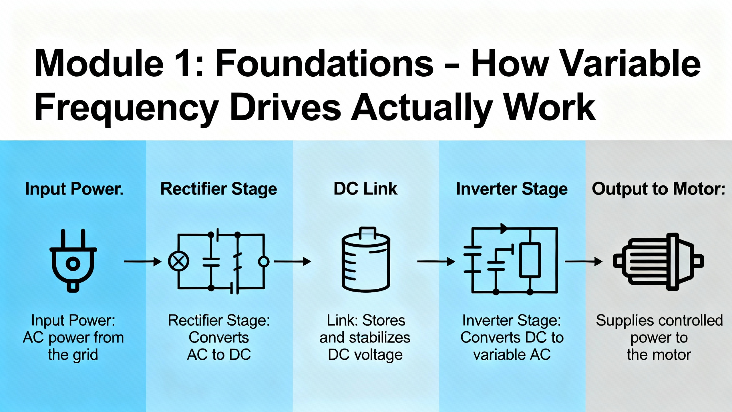Any serious course starts by demystifying what a drive does electrically and why that matters to configuration.