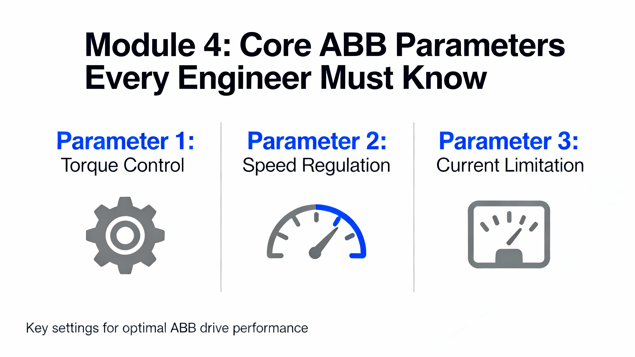 Once the right hardware is installed correctly, the course can focus on the parameters that truly matter. Control Engineering identifies five parameter groups that cover the overwhelming majority of industrial VFD programming. ABB drives follow the same logic, even if menu structures differ.