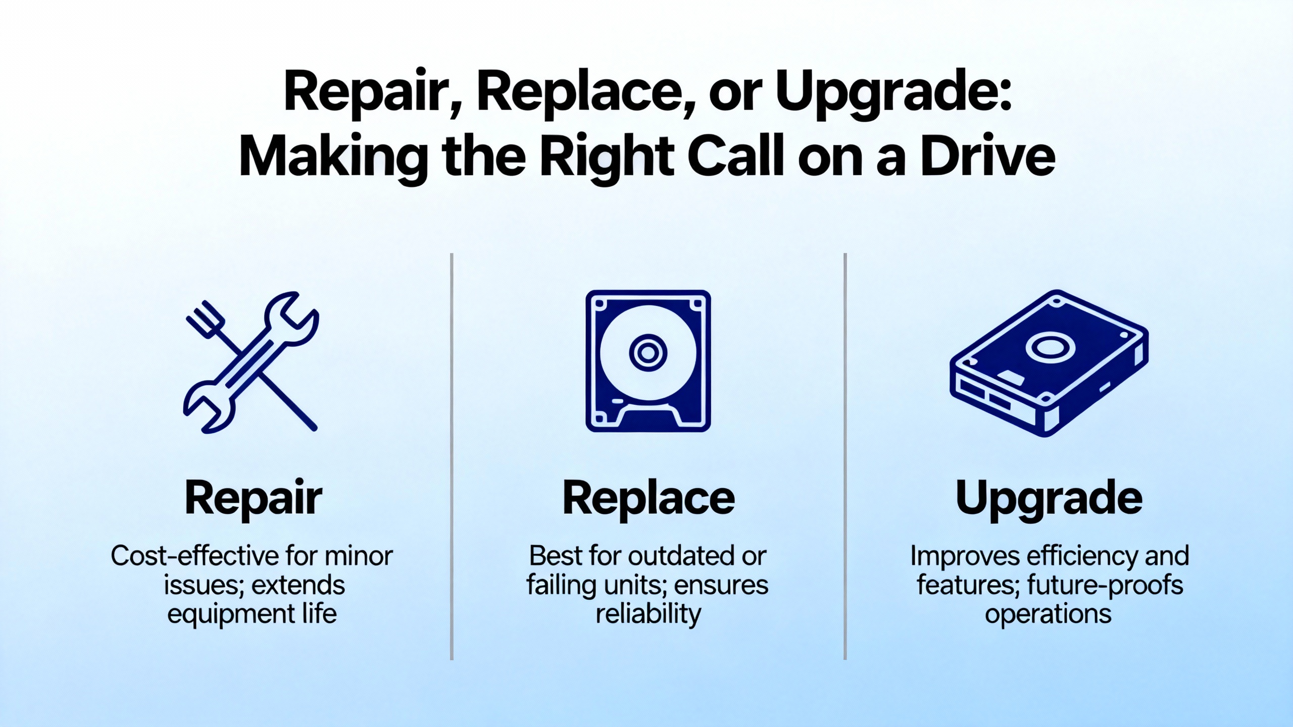Retaining the existing drive but making no change is rarely the right answer after a serious failure. Even when a quick reset gets you running, the failure analysis work described earlier should still be completed. Root causes such as overload, imbalance, harmonics, contamination, or control logic problems do not disappear on their own. Addressing them is what differentiates a reliable plant from one that lives in a cycle of repeated ABB drive 鈥渕ystery鈥 failures.