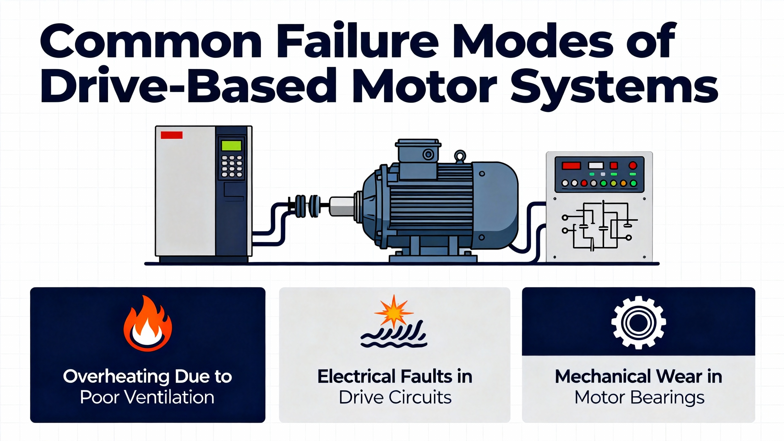 The third block is the motor. Studies summarized by Duke Electric and Fluke show that bearing issues and winding insulation breakdown dominate motor failures, with some sources attributing roughly half of motor failures to bearings and about thirty percent to overloading.