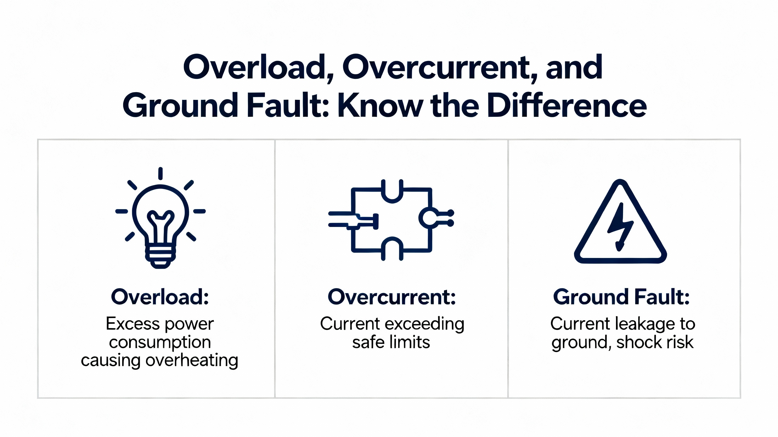 | Ground / earth fault | Significant residual current | Insulation failure, wiring fault to ground, damaged cable |