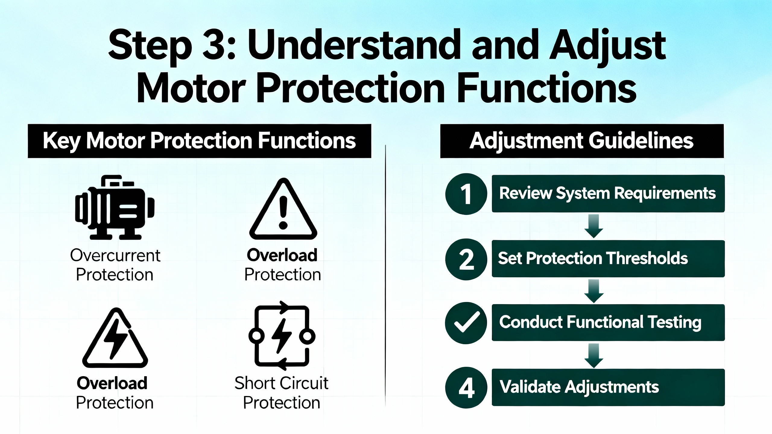 Once you have verified that the motor and drive are correctly sized, checked mechanical health, confirmed motor data, and inspected the environment and supply, you are ready to fine鈥憈une protection settings. The process should be deliberate and documented.