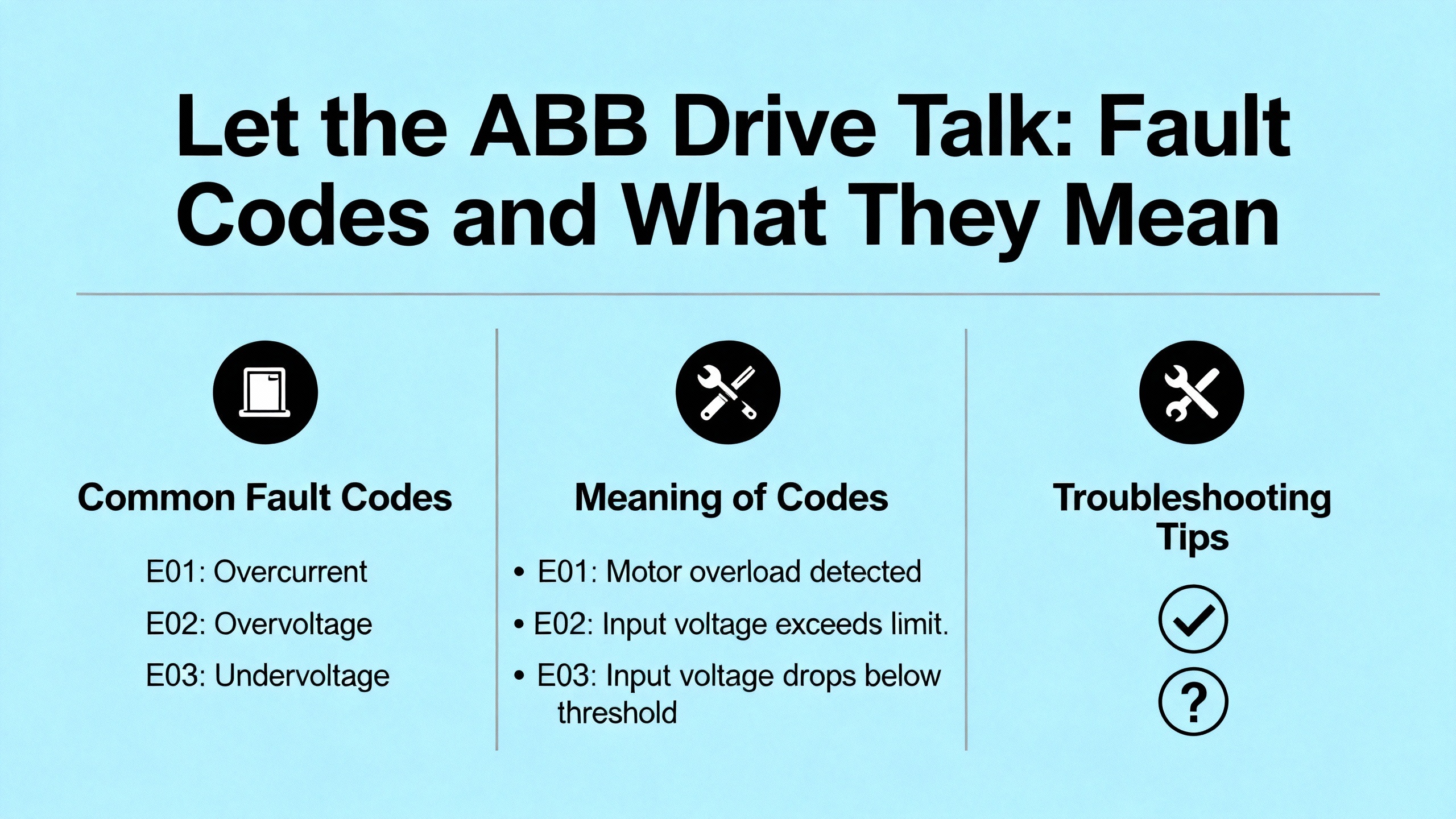 | ABB fault code | Meaning | Typical underlying issues | Key checks and actions |