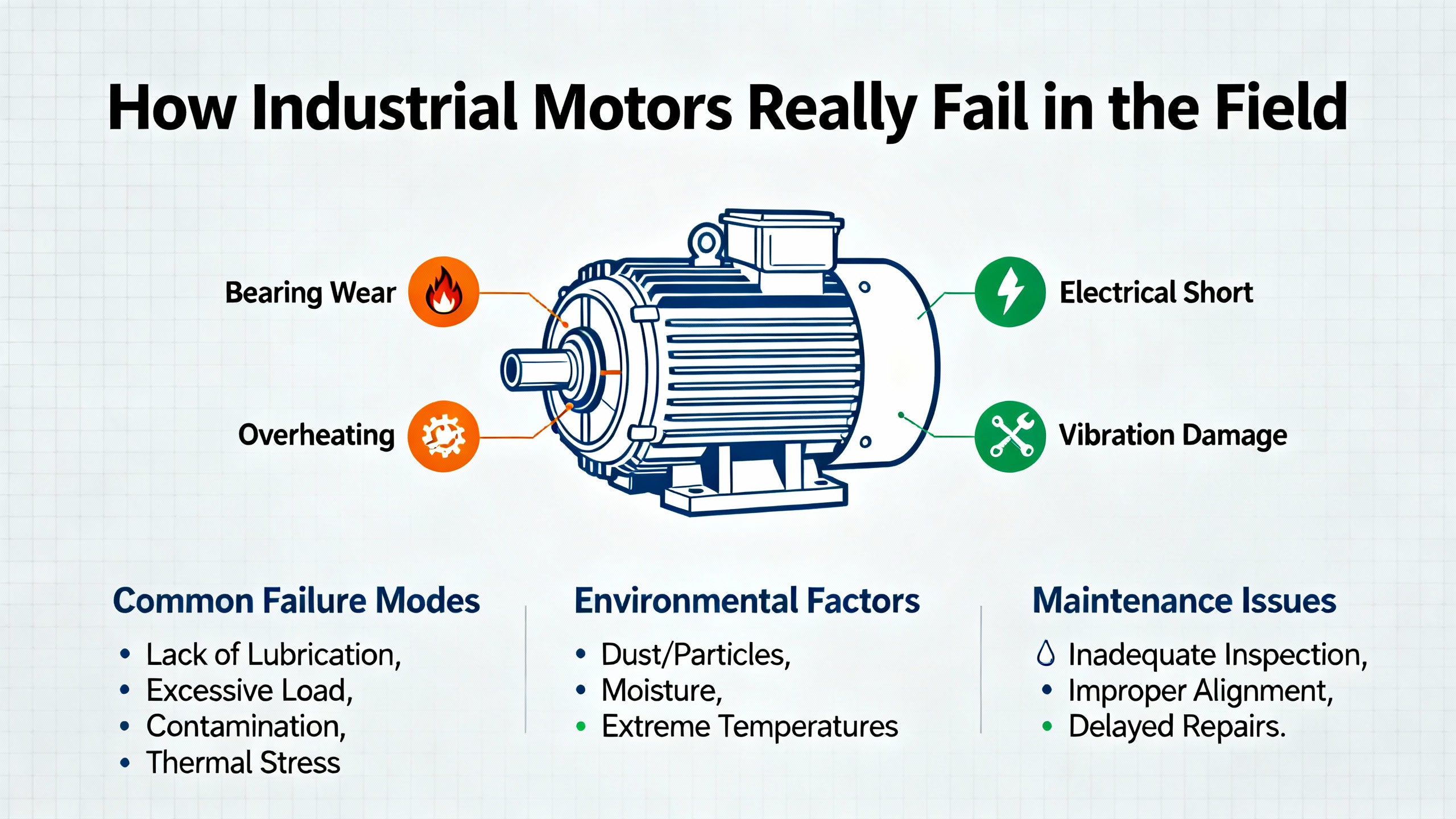 Replacing a failed bearing or rewinding a motor fixes the symptom, not necessarily the underlying cause. Duke Electric鈥檚 鈥渆ssential guide鈥 to motor failure makes this point clearly. If fifty-one percent of motor failures are classified as bearing failures but those bearings fail due to misalignment, high ambient temperature, moisture, shaft voltage, or overload, then the real cause lies elsewhere.