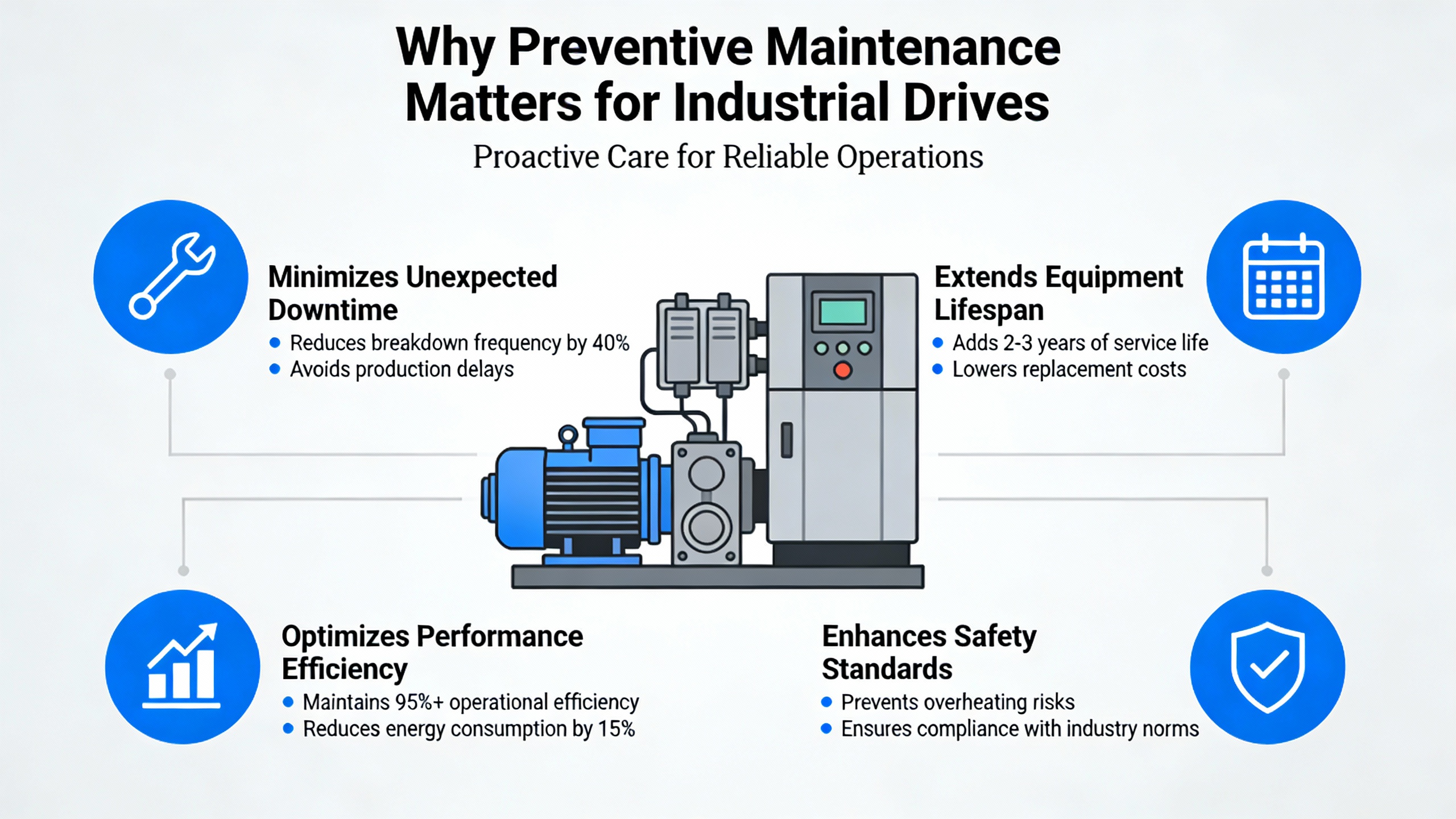 | Critical process drive in dusty area | Dust, vibration, heat, power quality issues | Quarterly cleaning and log review; annual deep inspection |