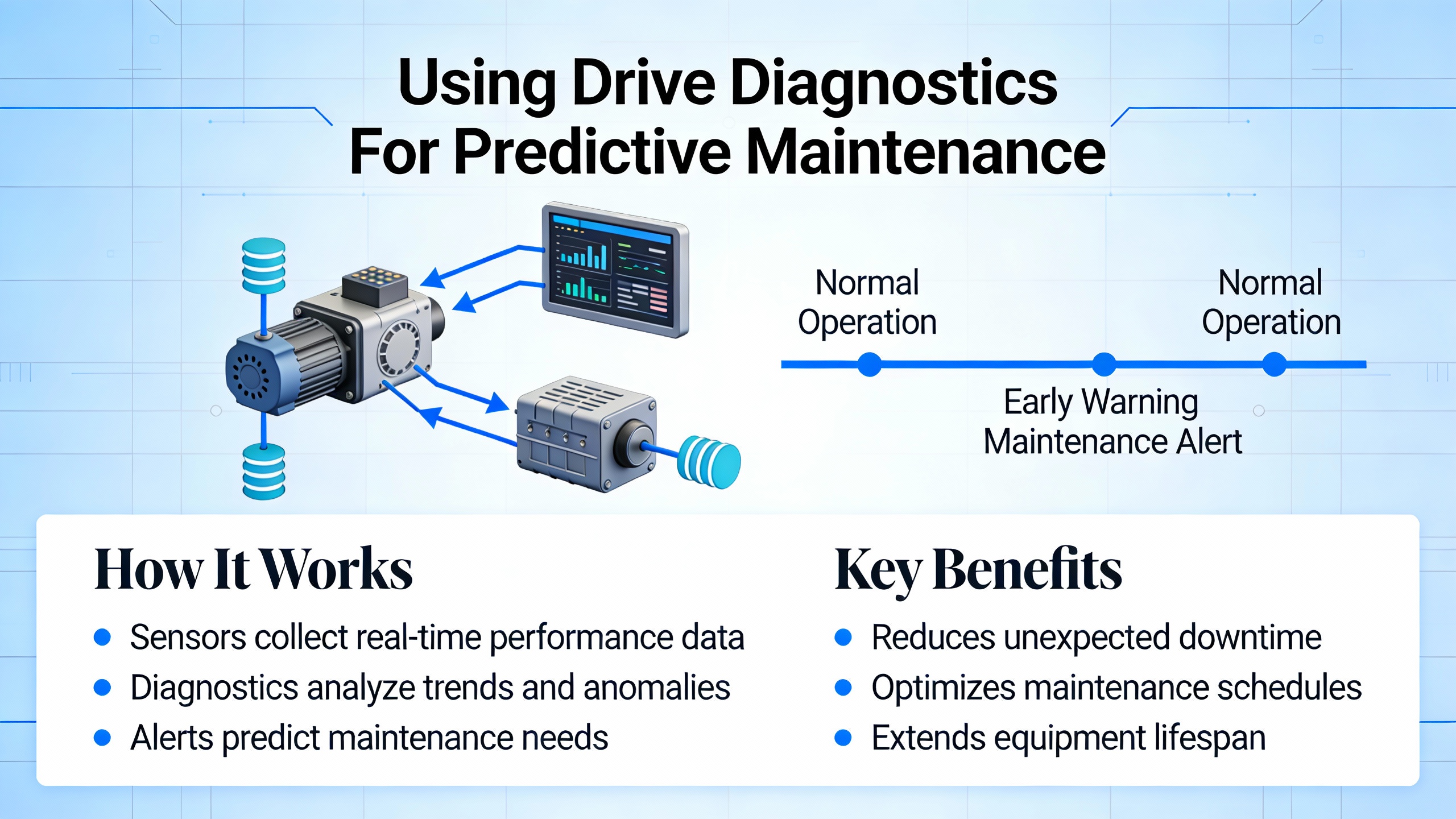 The key mindset shift is to treat drive alarms and logs as early鈥憌arning signals, not nuisances to be cleared. Predictive maintenance articles on drives note that intermittent or recurring faults are signs that operating conditions are drifting out of range. For example, trending motor current is highlighted as a simple but powerful diagnostic: a gradual rise in current at constant speed and throughput often points to worn or dry bearings, misaligned belts or gearboxes, clogged pumps or filters, or product buildup on conveyors. Acting on that trend before an overcurrent trip occurs turns a surprise outage into a scheduled mechanical repair.