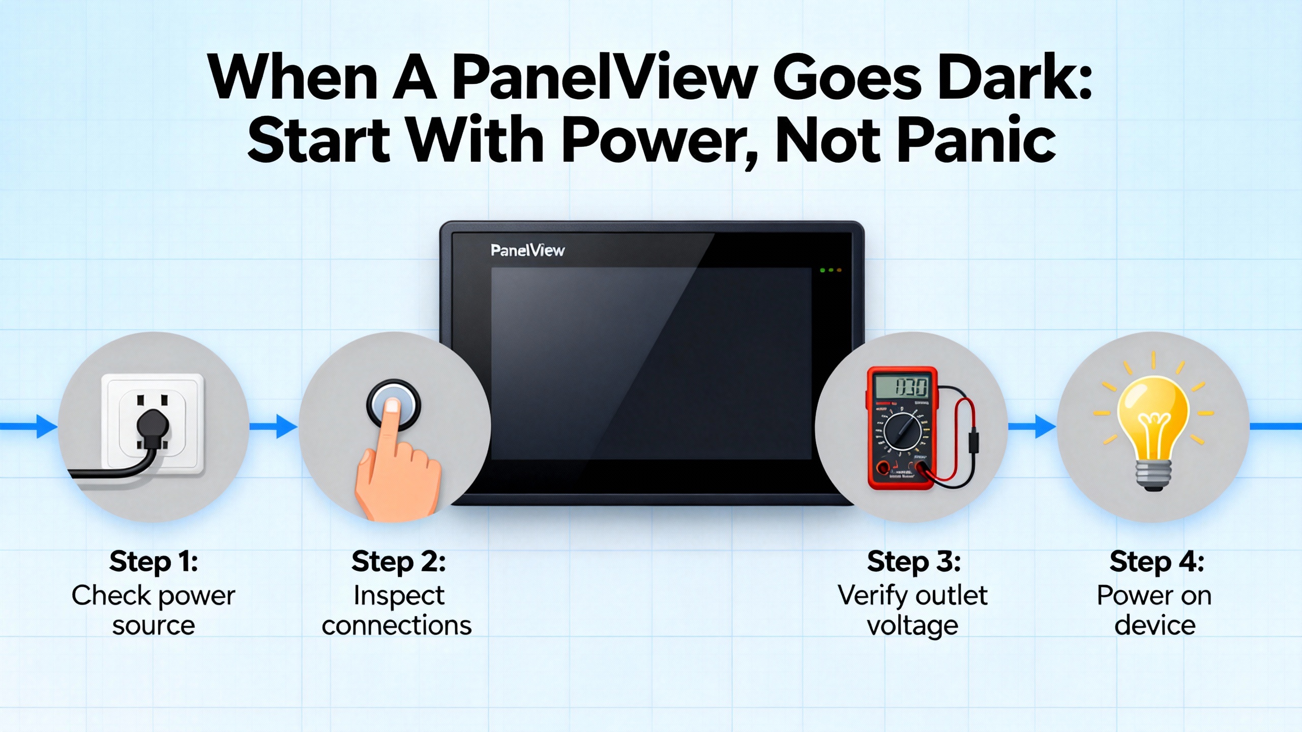 Then measure at the HMI side, not just at the supply output. Industrial Automation Co. stresses this point because wiring drops, loose connectors, and internal panel fuses can drop voltage between the supply and the HMI. A simple check with a multimeter at the PanelView terminals often reveals reversed polarity, low voltage under load, or a blown fuse on an internal power board. IVS Incorporated and Apter both note that these kinds of basic electrical problems frequently show up as flickering screens, distorted images, or devices that suddenly refuse to boot after a power disturbance.