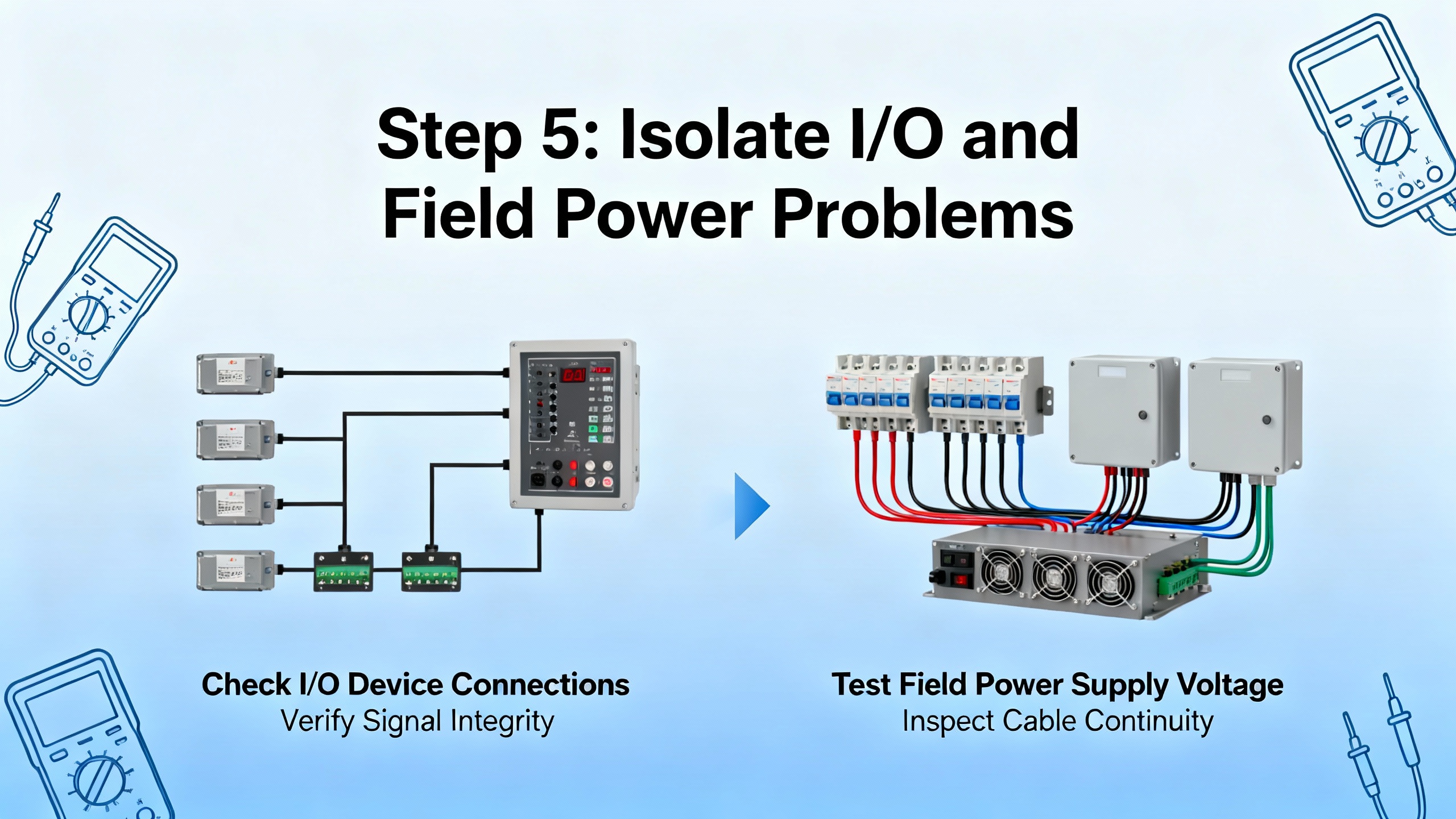 Once you know the CPU is running correctly, attention turns to whether the PLC can actually see and control the outside world. Industrial Automation Co. identifies “I/O Not Responding” errors as one of the most common problems across Allen‑Bradley platforms. PLCDepartment and HESCO echo that many failures manifest as unresponsive sensors, dead motor outputs, or analog values frozen at default.