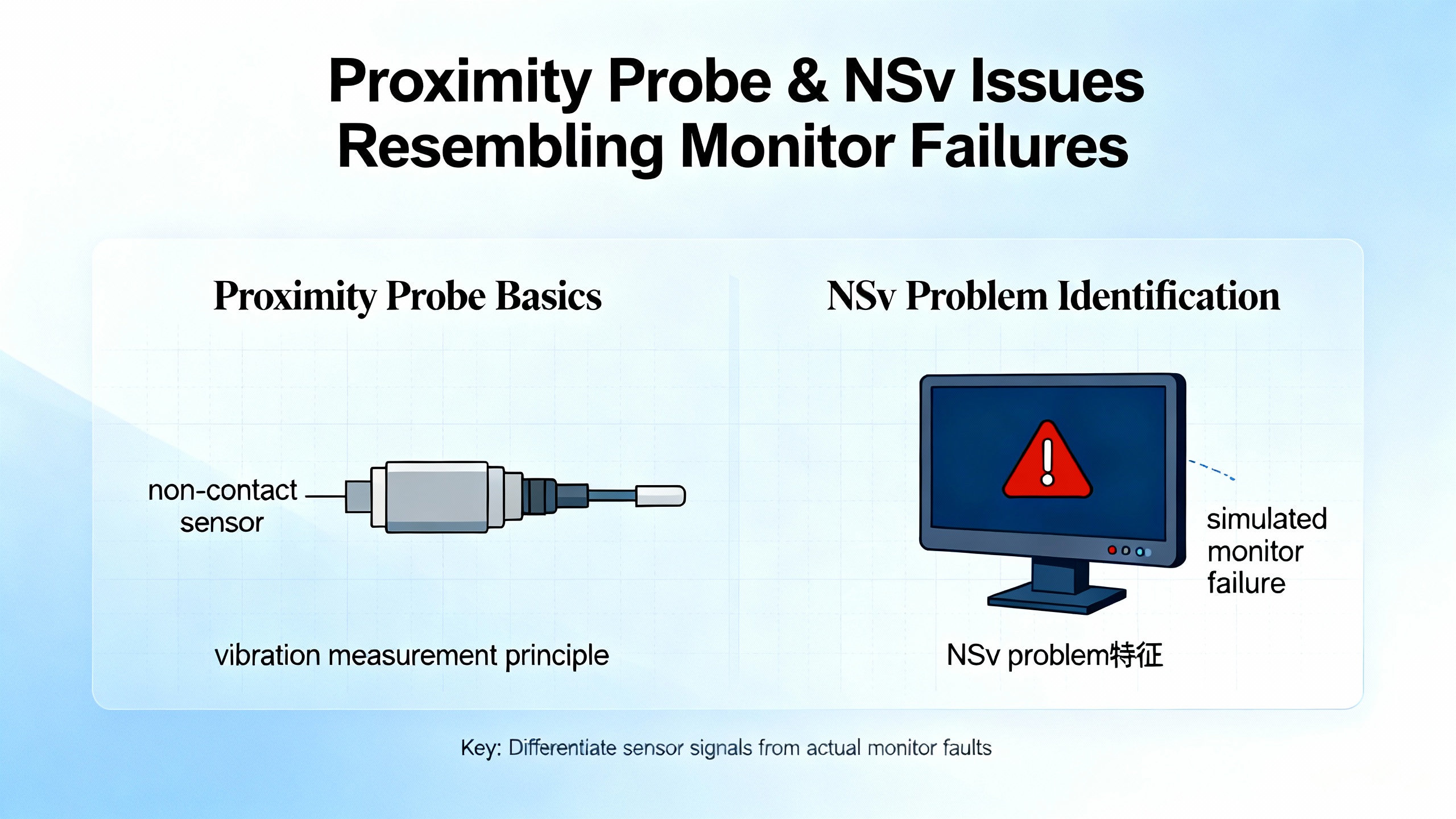| 3300 NSv proximity probe | Shaft vibration/position sensing | Zero or unstable signal, noisy trends, gap voltage out of range |
