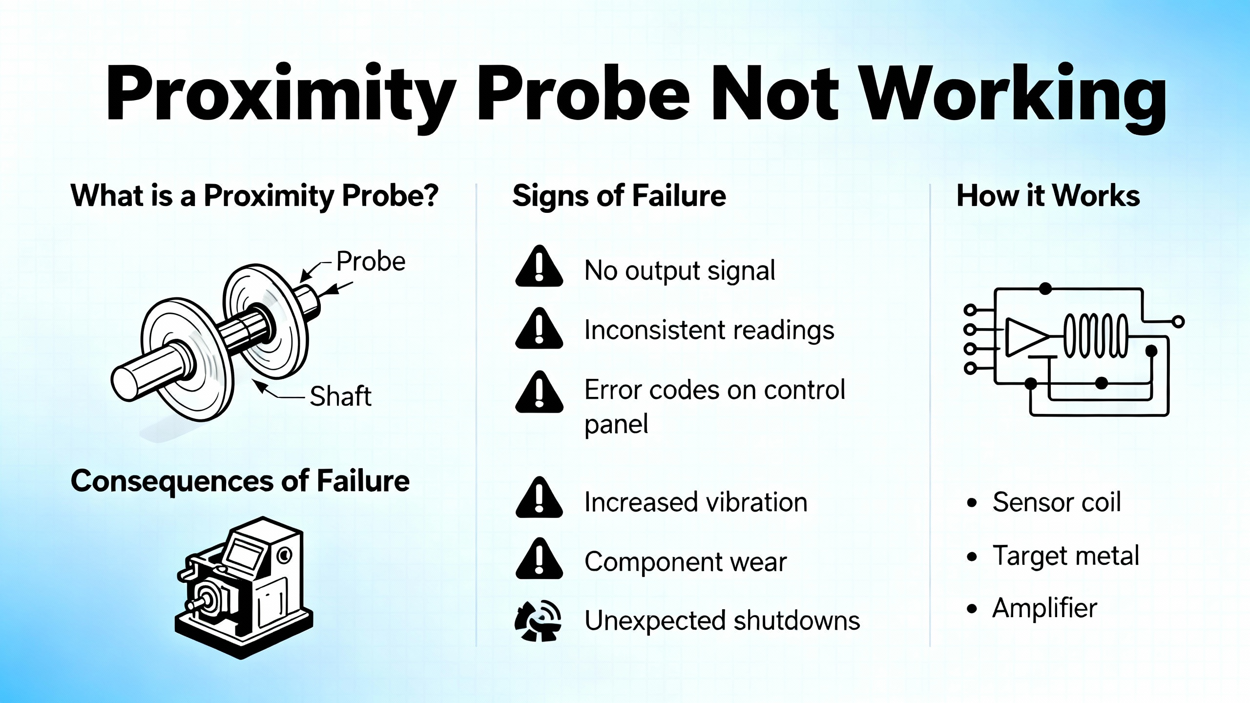 | Proximitor | Powers probe, demodulates signal, outputs DC gap + AC vibration | Extreme voltages, frozen reading, 鈥淣ot OK鈥 on monitor |