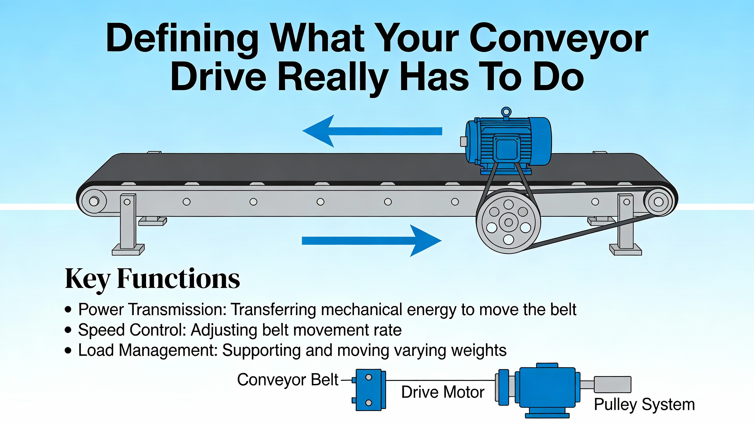 Product characteristics are more than a catalog description. They include size, weight, shape, surface, material, and any special traits such as abrasiveness, fragility, moisture content, or explosiveness. AEC Carolina stresses that these characteristics determine the conveyor type, belt surface, and speed needed for stable transport. Macawber India goes even further, noting that issues such as flammability, corrosiveness, or the need to maintain specific product temperature all influence conveyor choice. These product traits in turn drive the torque, starting capability, and speed range that the drive system must deliver.