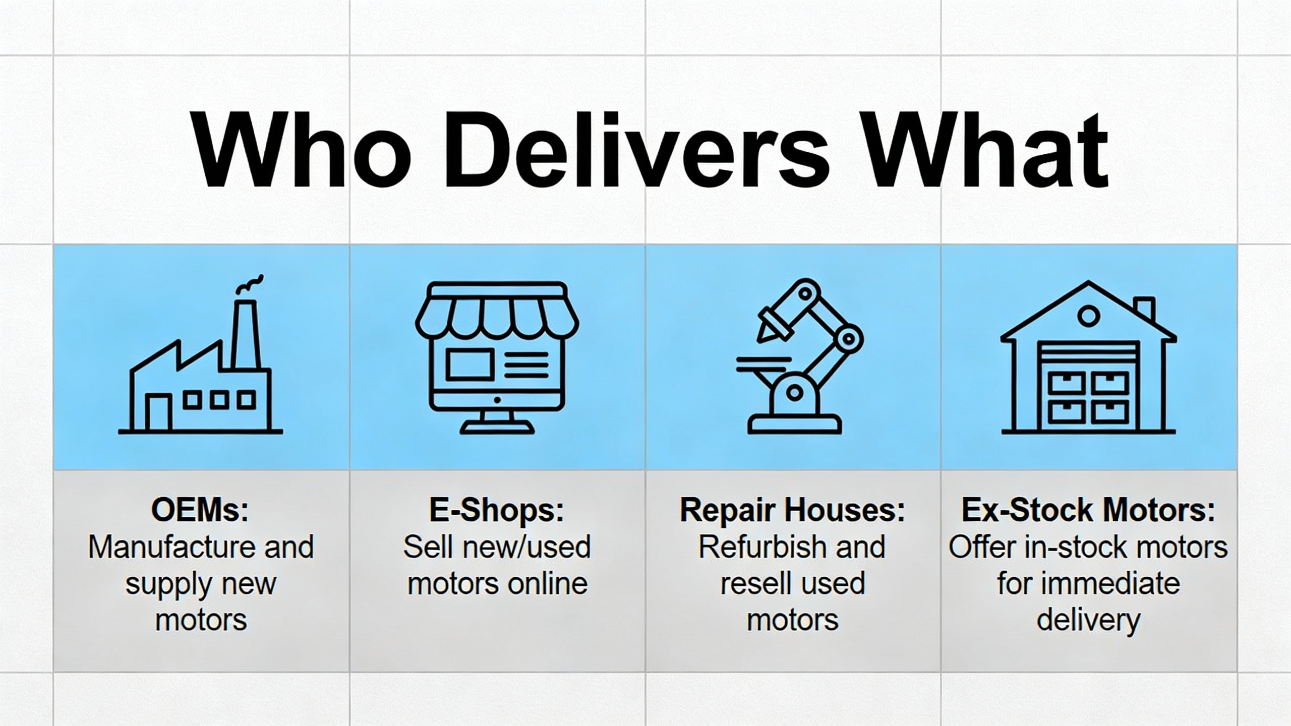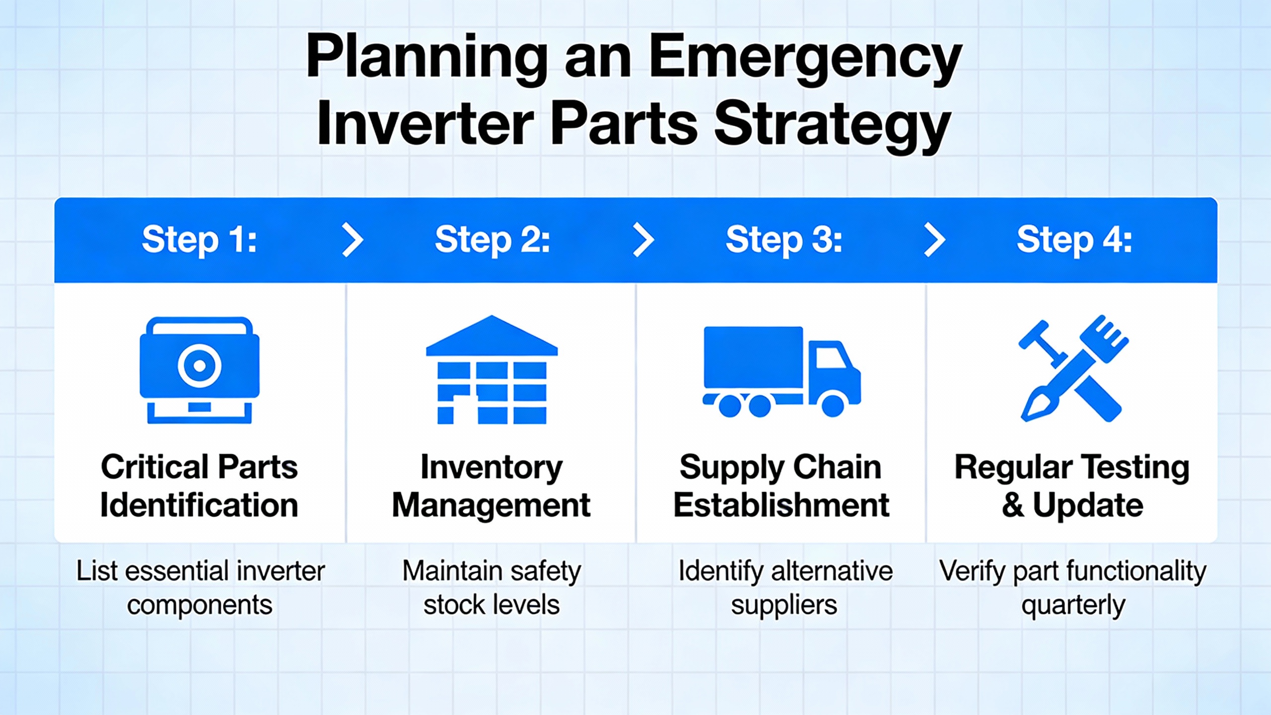 Taken together, these examples suggest that a robust emergency inverter parts strategy rarely relies on a single supplier. A realistic plan blends OEM regional warehouses, configurable e鈥憇hops, specialist repair houses, and emergency motor replacement services, with each channel aligned to a different class of failure and time horizon.