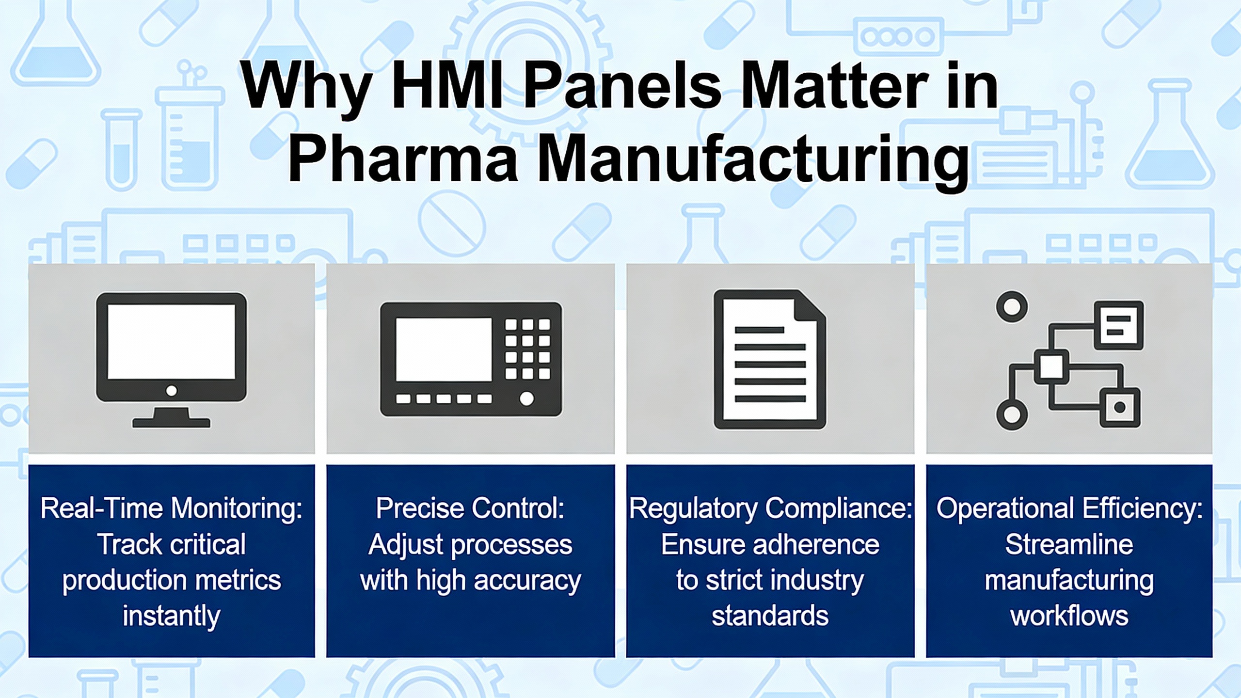 An HMI in this context is the hardware and software panel through which operators interact with equipment, programmable logic controllers, and process control systems. As described by several industrial automation providers, these panels present real-time process values, alarms, trends, and workflow prompts so operators can start, stop, adjust, and document every step of drug manufacturing.
