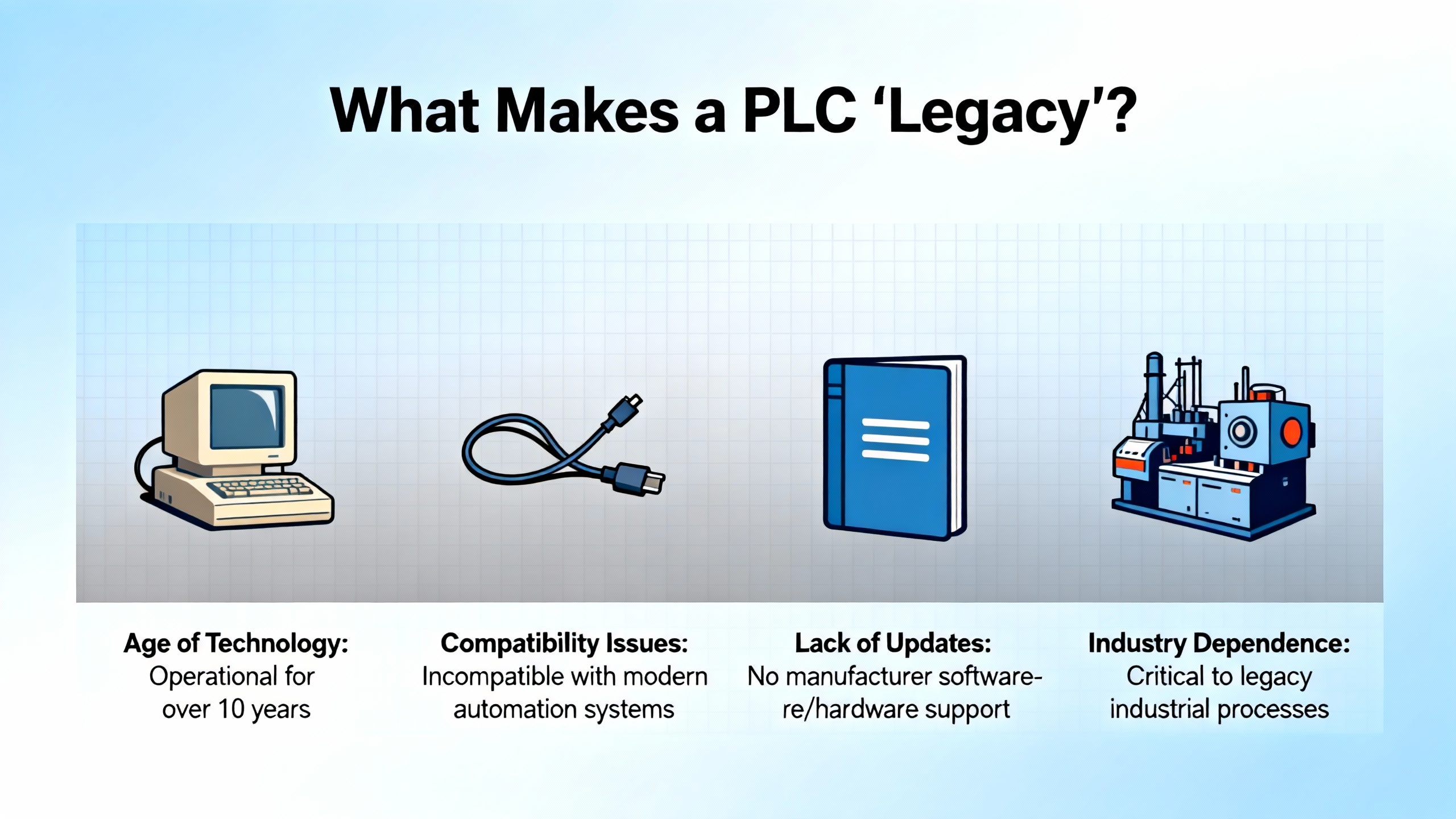 Industry notes from automation suppliers and integrators describe legacy PLCs with common symptoms. Hardware is decades old, processing power is limited, and memory and communication bandwidth are tight. Vendor support has ended or is close to end-of-life, including the programming environments. Spare parts are scarce or purchased from secondary markets. The engineering workforce that understands the platform is shrinking, so every retirement takes tribal knowledge with it.