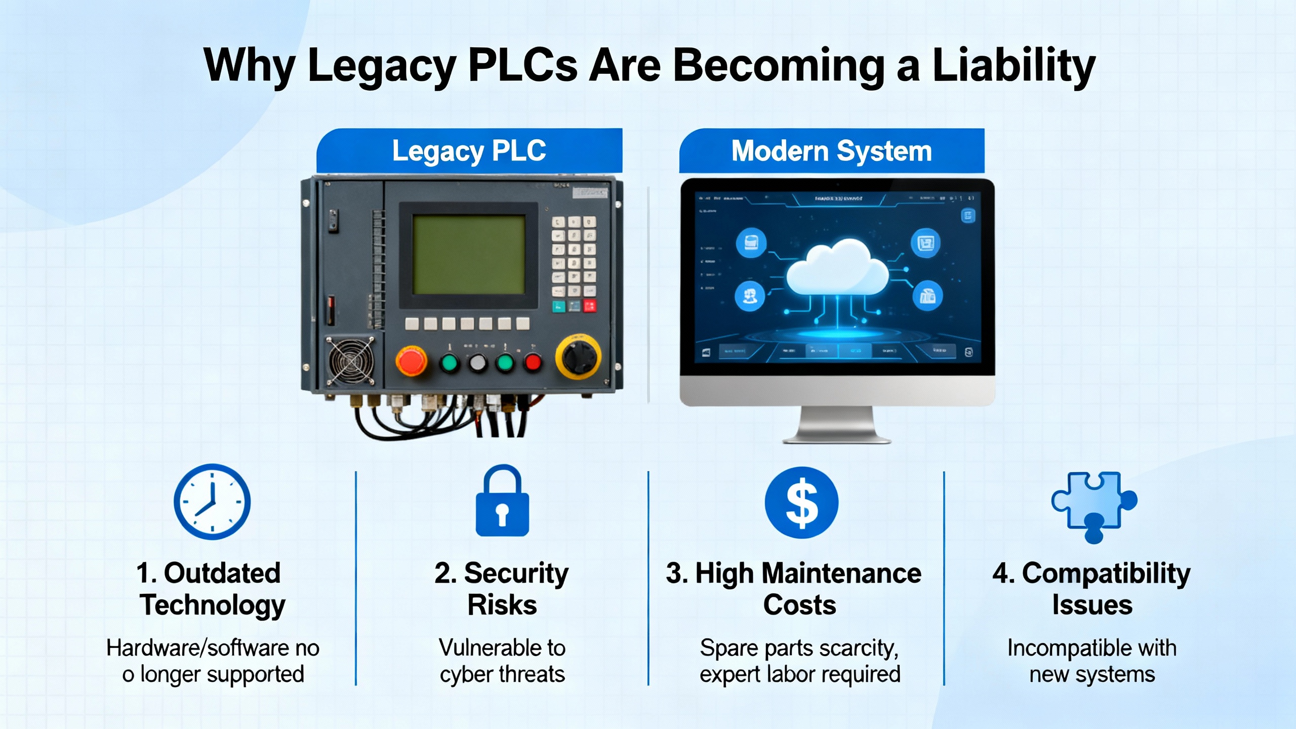 ISD Automation and Pacific Blue Engineering both argue that missing modern communication protocols, integrated safety, and robust data handling are strong indicators that upgrade is overdue. Many legacy PLCs cannot speak Ethernet/IP, MQTT, or OPC UA, limiting integration with SCADA, historian, cloud, or energy management systems.