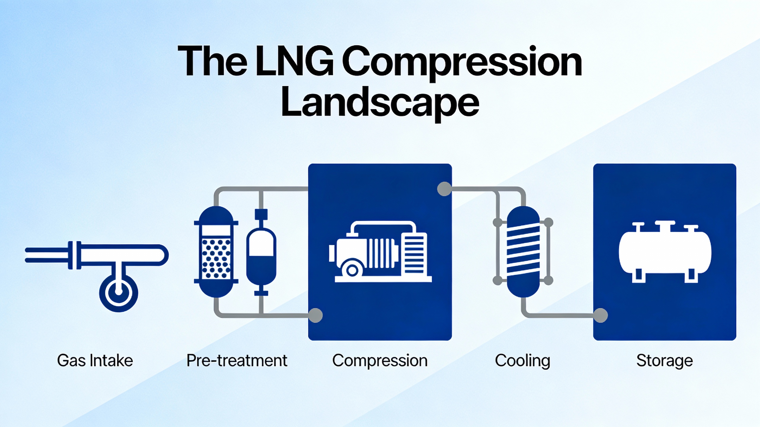 Compressors touch almost every stage of the LNG chain. China Compressors and Detechtion both emphasize that compression is essential upstream to pressurize gas for treatment, in midstream pipelines and storage, and downstream in LNG processing, shipping, and regasification.