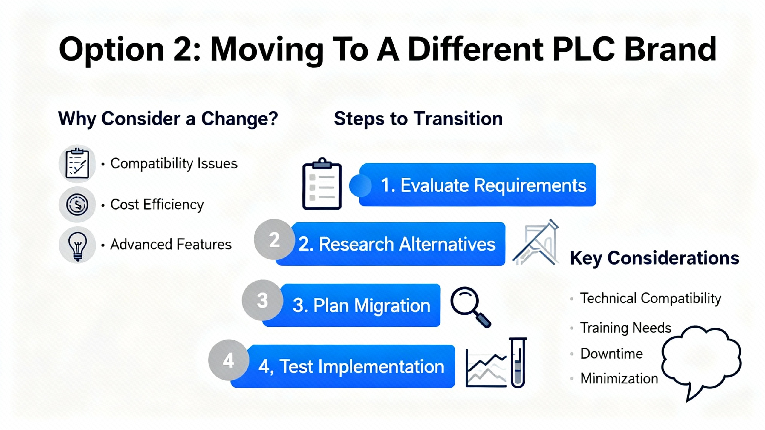 If you are leaning toward another brand, you should apply the retrofit-friendly criteria described by Industrial Automation Co. and LC Automation. Start with communication: can the new PLC speak to your existing drives, remote I/O, safety systems, and HMIs without wholesale replacement? Then examine I/O style and voltage compatibility, program structure, HMI tag layouts, and long-term lifecycle support. Recognize that Siemens, Allen-Bradley, Schneider, ABB, Omron, Delta, Panasonic, LS ELECTRIC, and Mitsubishi all build world-class PLCs and that the differentiators are often regional support strength and your team’s familiarity with the ecosystem.