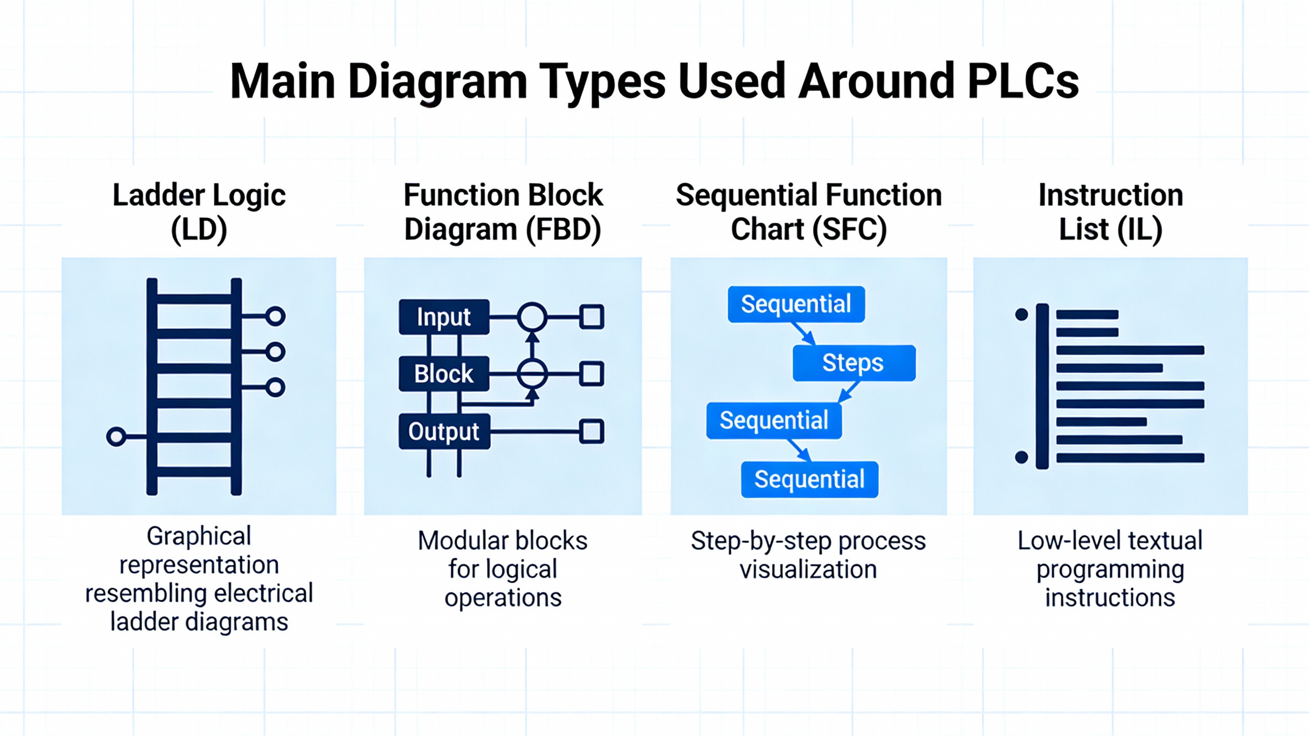 AUSINET and ControlByte both emphasize that you need to identify what kind of drawing you are looking at before you try to interpret it. PLC and industrial power systems usually rely on several diagram types that complement one another rather than one all鈥憄urpose drawing.