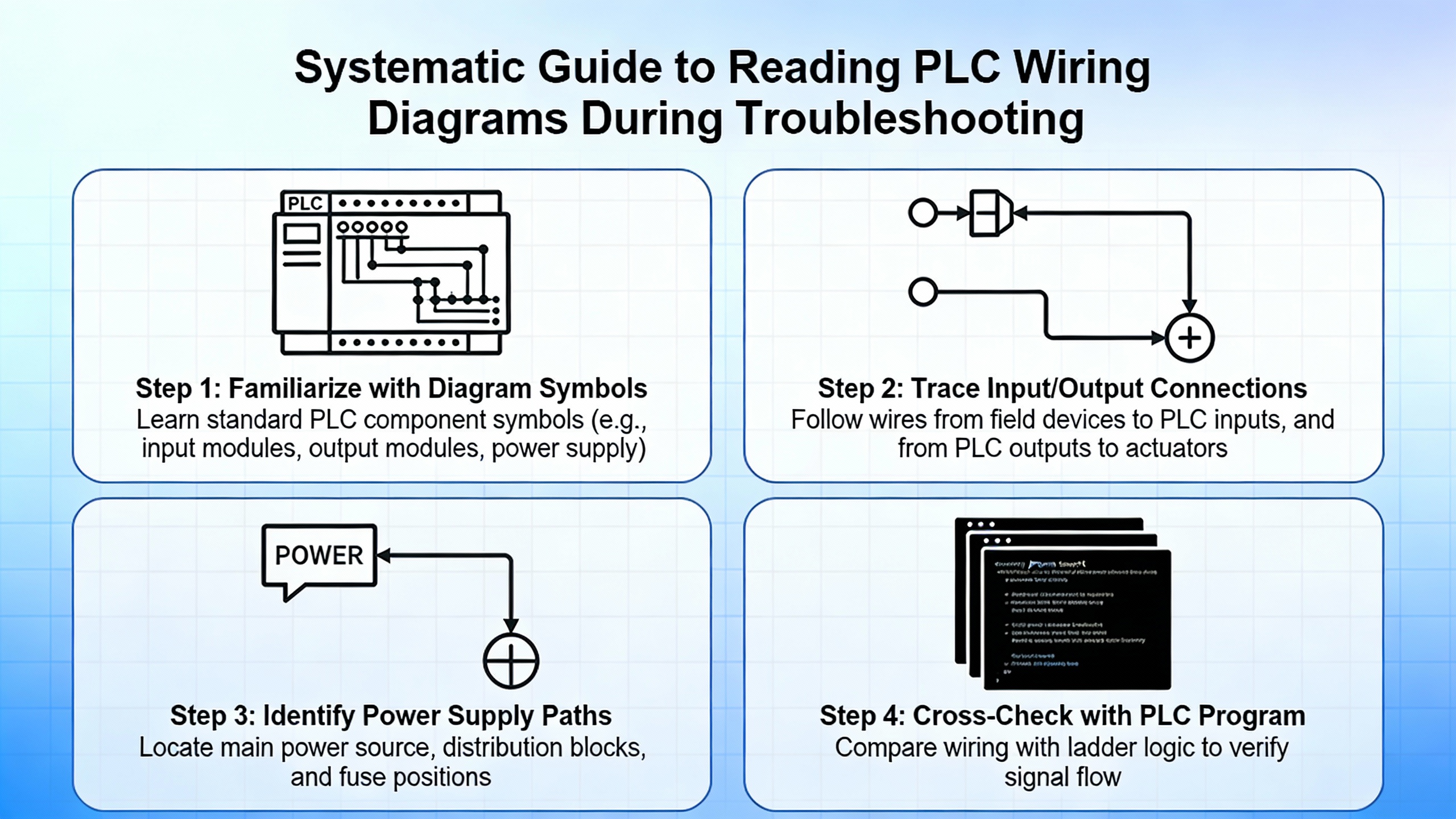 AUSINET recommends starting by identifying the diagram type and purpose, then following power flow from the source through the circuit to trace operation and locate faults. ControlByte advises starting with simple diagrams and working up to full industrial drawings, making use of cross鈥憆eferences and potential lines to see how different voltage levels and pages connect. Do Supply suggests a practical method specifically for PLC wiring: begin at the field device tag, follow the conductor and cable numbers back to the panel terminal strip, then to the I/O card terminal, and finally map that channel to its PLC address and rung in the logic. SolisPLC-style documentation often supports this by dedicating one drawing page per PLC card, showing each field device wired to each specific I/O point.