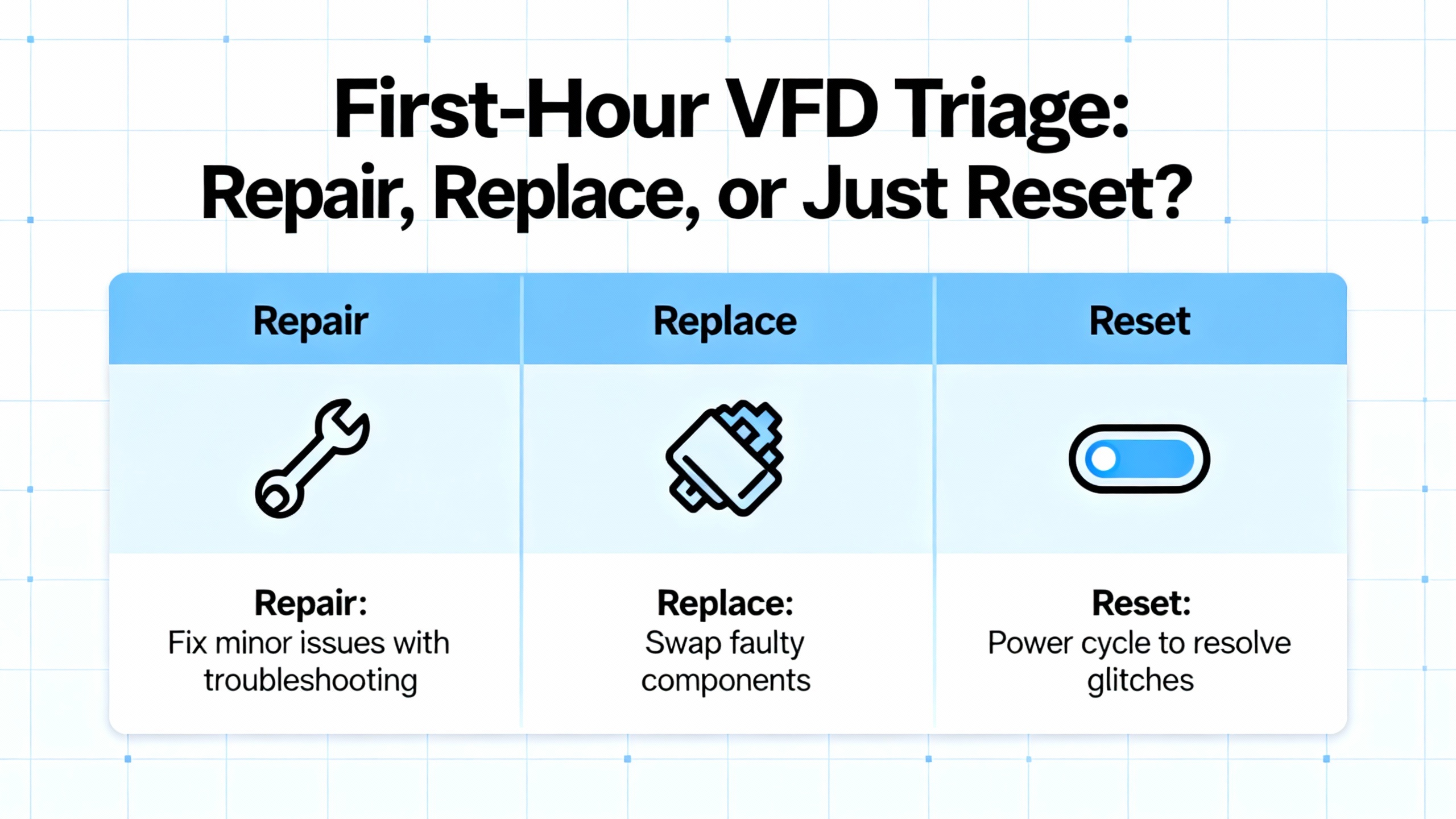 This article walks through how to think about emergency VFD parts, what actually needs to be on the shelf, how to work with same-day suppliers and repair partners, and how to reduce the chances that you will need that emergency kit in the first place. The guidance draws on field experience and on best practices documented by OEMs, integrators, and reliability organizations such as ABB, EMA, IEEE, and others.