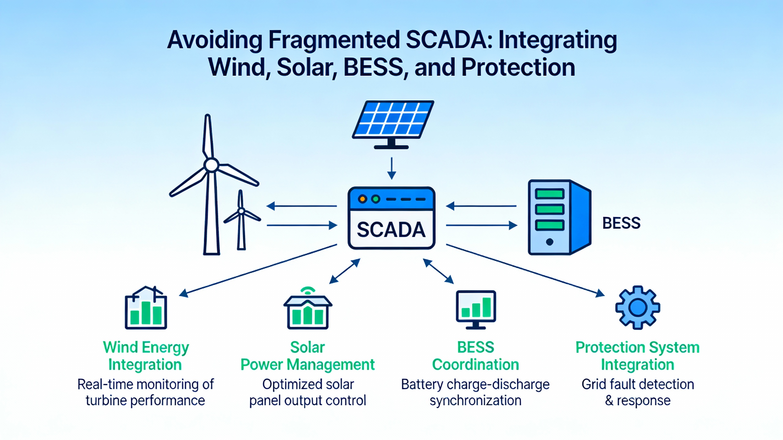 Many owners discover SCADA in stages. Inverters come with their own dashboards. The battery supplier brings an energy management interface. Meteorological equipment has its own logger. Australian Control Engineering warns that this 鈥淔ragmented SCADA Syndrome鈥 leads to operational blind spots, slower fault response, inconsistent data, and higher compliance risk. Their work on holistic SCADA integration for solar farms defines integration as consolidating inverters, battery systems, weather stations, protection relays, and grid interfaces into a single control and monitoring platform.