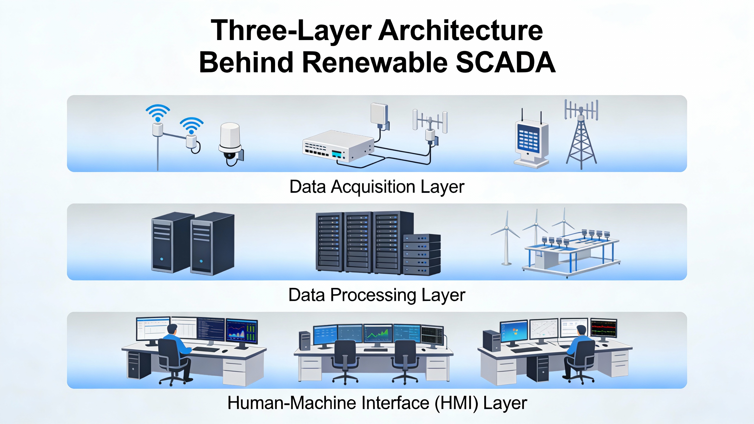| Field layer | PV modules, string combiner boxes, inverters, wind turbines, sensors, meters, RTUs, PLCs, protection relays, BESS interfaces | Measure and act on real-world conditions; where faults actually originate |