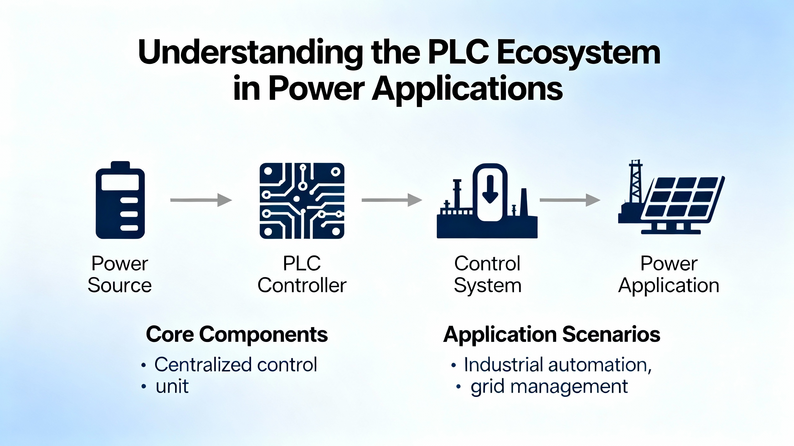 A programmable logic controller is a hardened industrial computer that reads inputs, executes control logic, and drives outputs in real time. In power systems, those inputs may be breaker positions, bus voltages, UPS status contacts, temperature sensors, or energy meters. Outputs might be breaker close commands, transfer switch signals, start commands to generator sets, or control words to inverters.