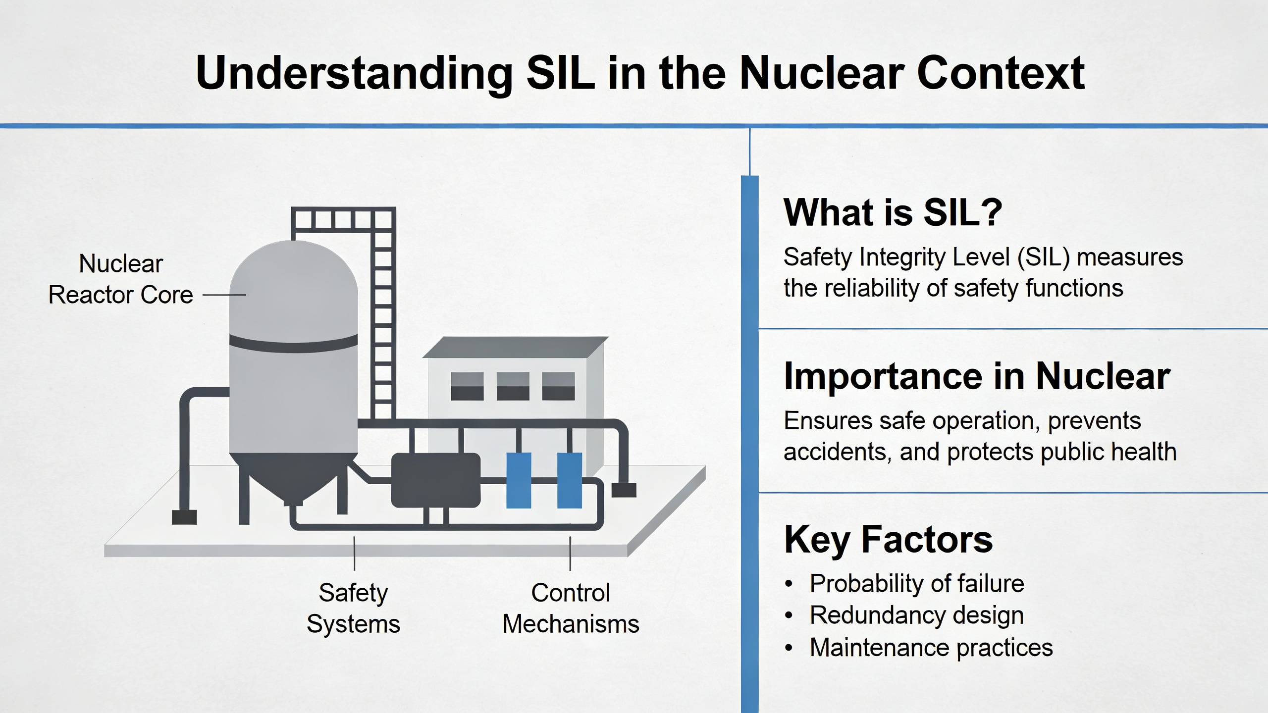 To see why, imagine that a particular nuclear hazard analysis identifies an initiating event with a frequency of about once in ten thousand reactor鈥憏ears and that, without an automatic shutdown, that event would lead directly to core damage. If your overall safety goal is to limit core damage to less than about one in one million reactor鈥憏ears, you need roughly a hundred鈥慺old reduction in risk from protection systems and other measures. That places you in the range of a Safety Instrumented Function with SIL 2 performance, assuming other layers of protection, such as operator actions and physical barriers, are already accounted for. In practice, nuclear designers allocate risk reduction across multiple systems, but this simple illustration shows how SIL concepts can be aligned with nuclear design criteria.