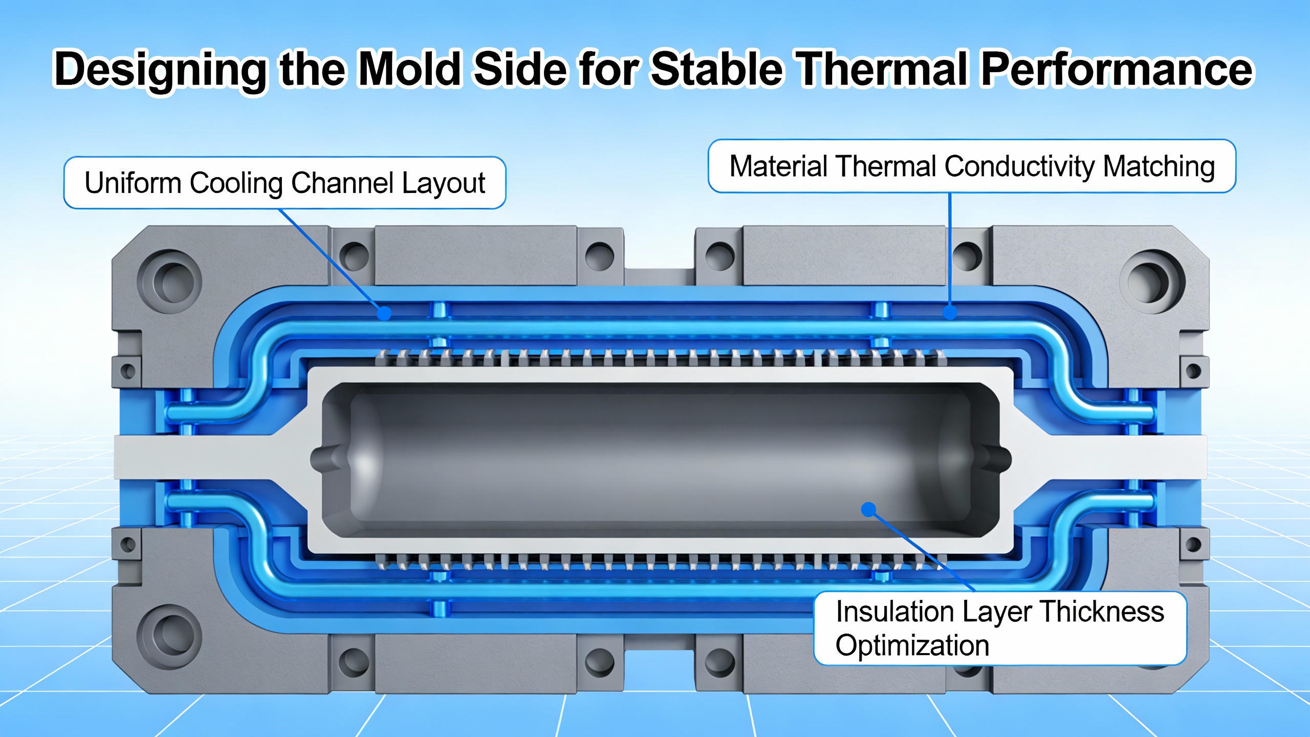 North Slope Chillers detail how traditional drilled channels in straight lines often struggle with complex geometries like deep cores, ribs, or bosses. Designers use baffles to force flow across a channel, bubblers to carry coolant into narrow cores and let it spill back, and thermal pins that use internal phase change to move heat quickly to the main cooling line. For advanced tooling, conformal cooling 鈥 channels that follow the three鈥慸imensional shape of the part 鈥 dramatically improves coverage and can cut cycle times while reducing defects.