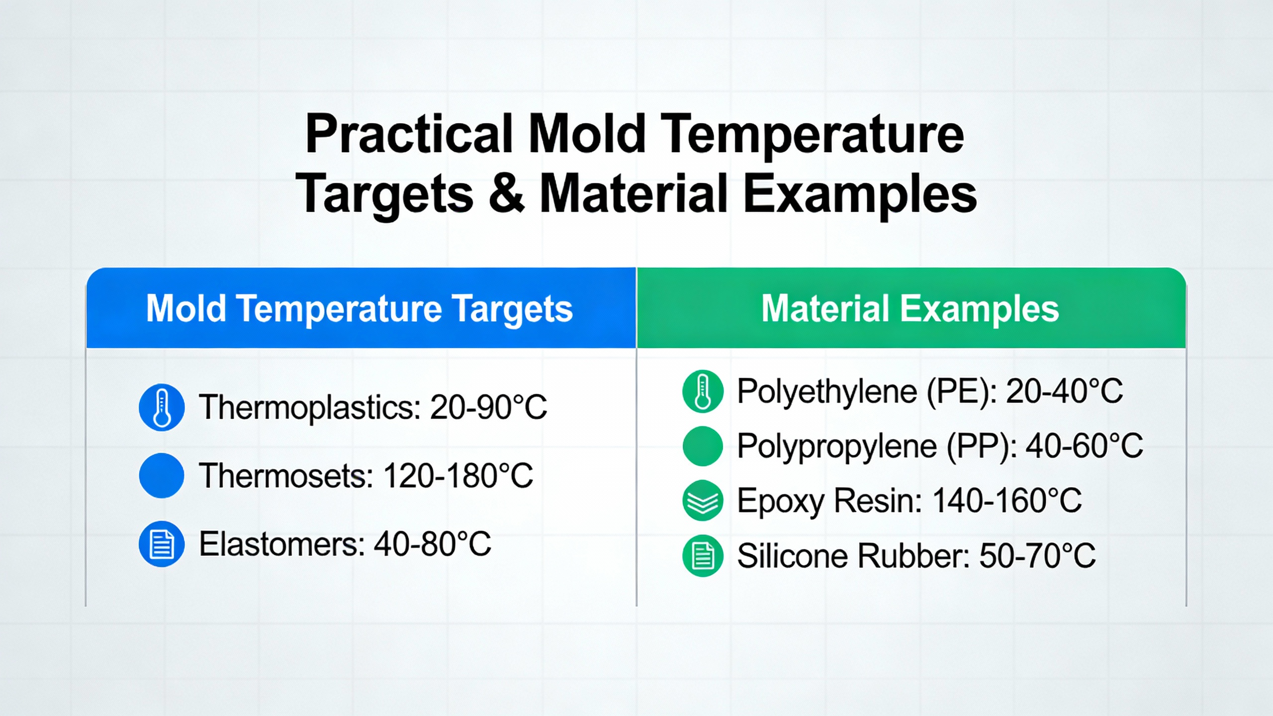 | Medium / System type | Approximate mold temperature band (掳F) | Typical use |