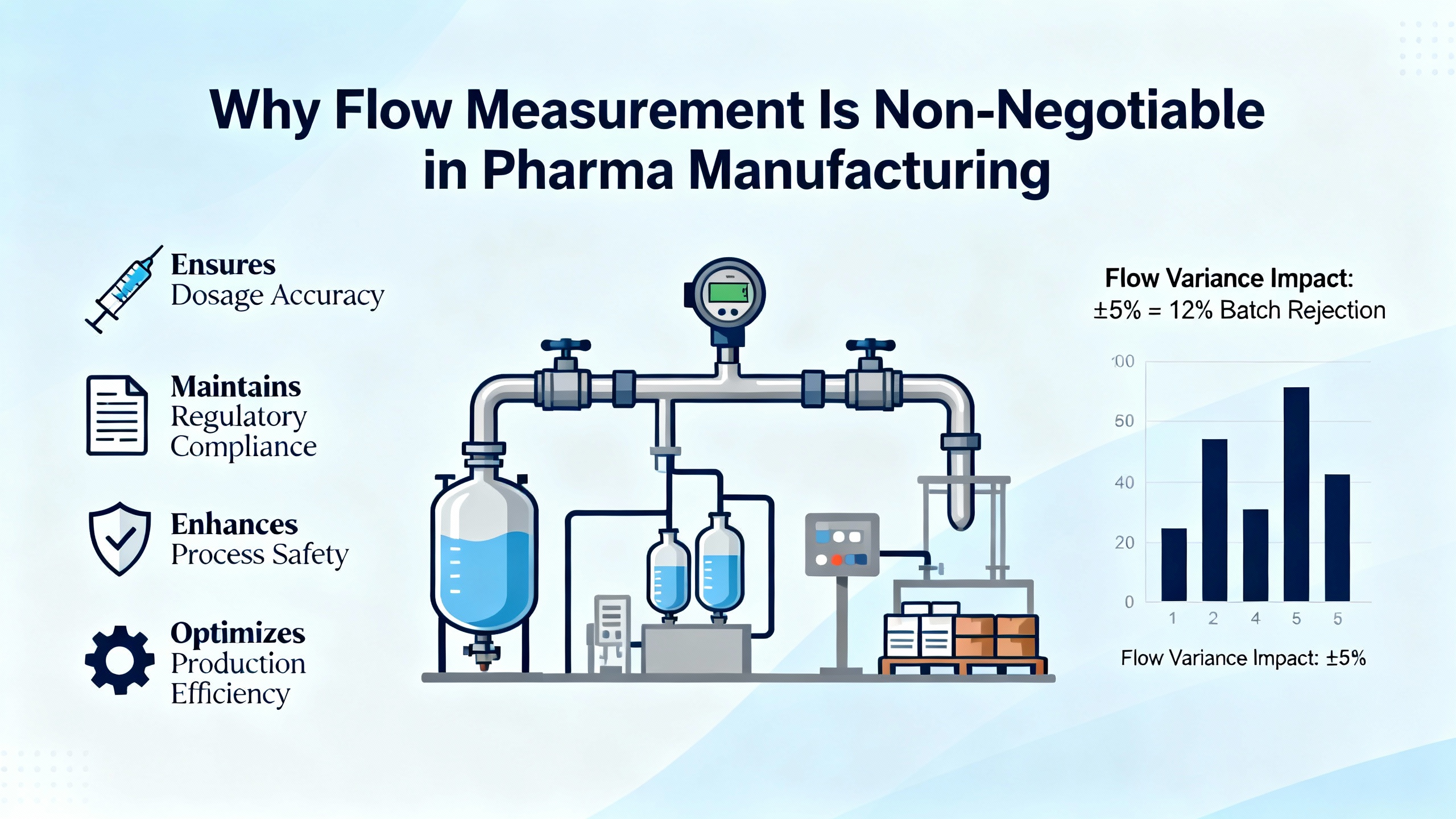 In pharmaceuticals, this seemingly simple measurement underpins almost every critical step. Research from BCST Group, Burak, and others highlights three big reasons accurate flow measurement is treated as a foundational control function rather than a convenience.