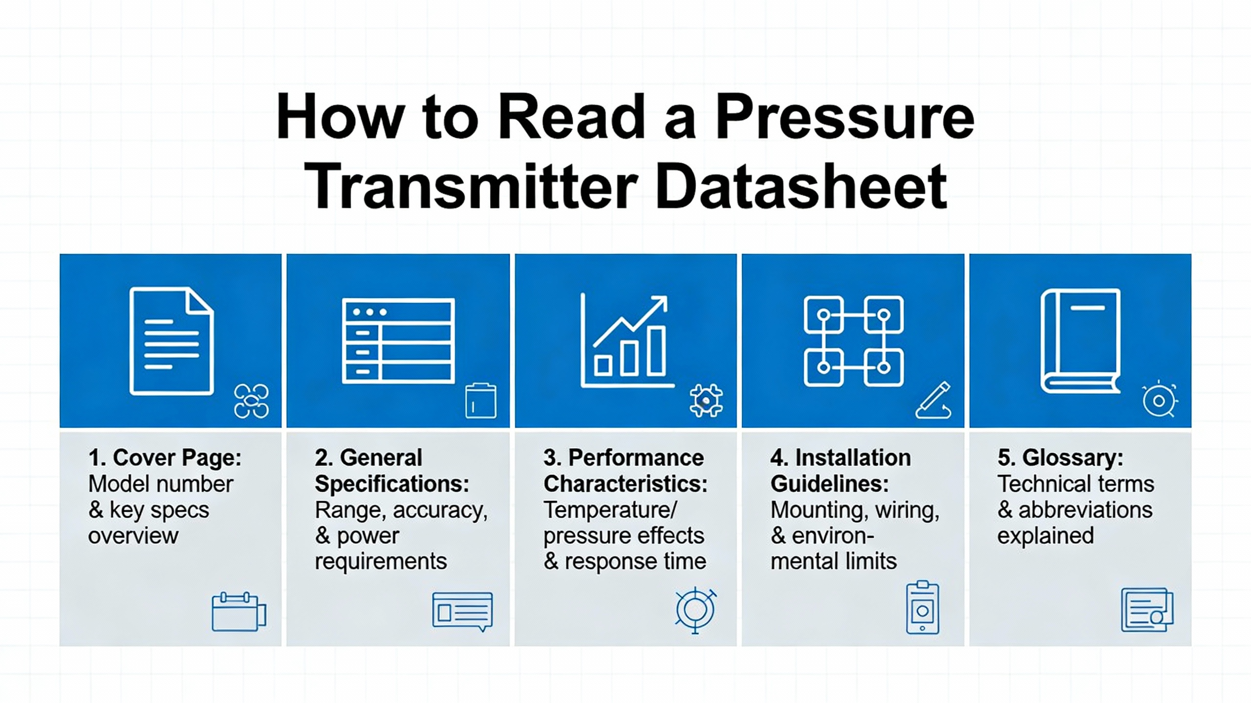 Instrumentation references from AutomationForum and BCST Group emphasize that a pressure transmitter datasheet is the primary reference for specifications, operating conditions, and limitations. For Yokogawa transmitters, the datasheet generally follows a structure that aligns with those best practices.